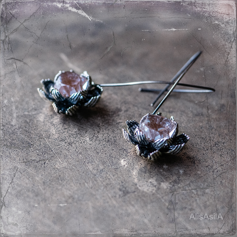 These silver earrings are decorated with a silver flower of lotus with sapphirite inside.
