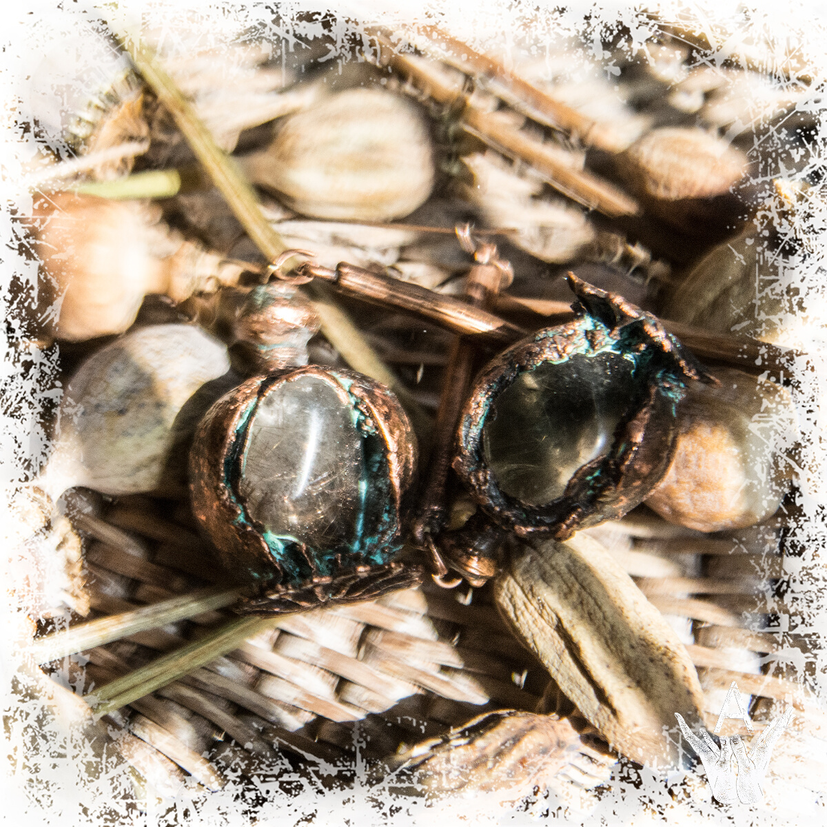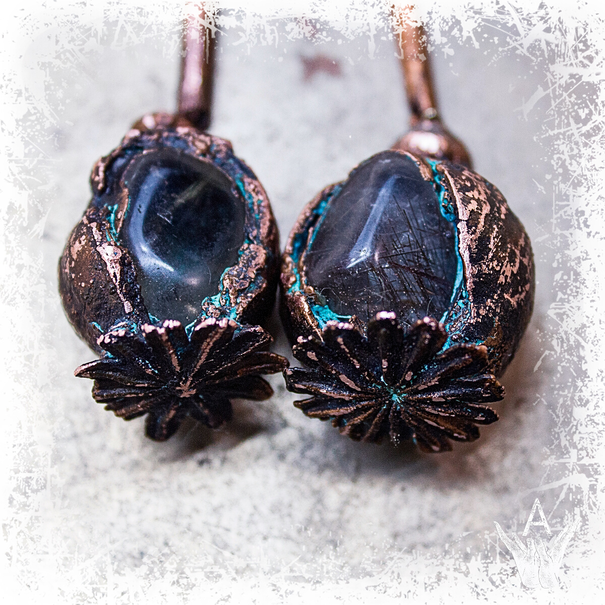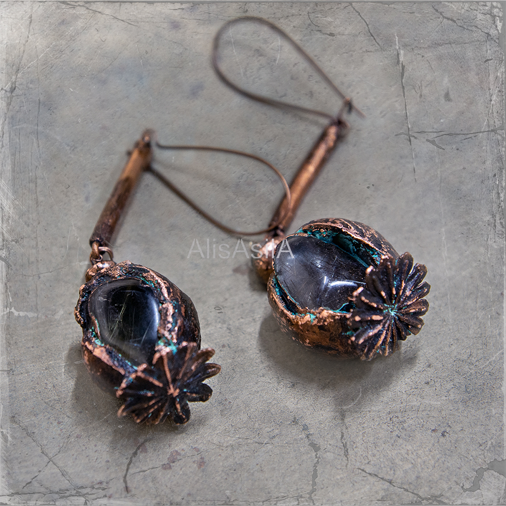 These earrings are made in the form of poppies: galvanized copper and quartz hair-stone, crystal poured into metal. Poppies filled with crystals of Venus Hair — a strong and magical jewelry for women.