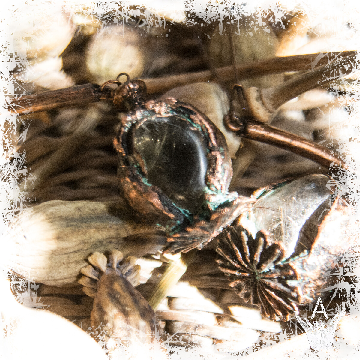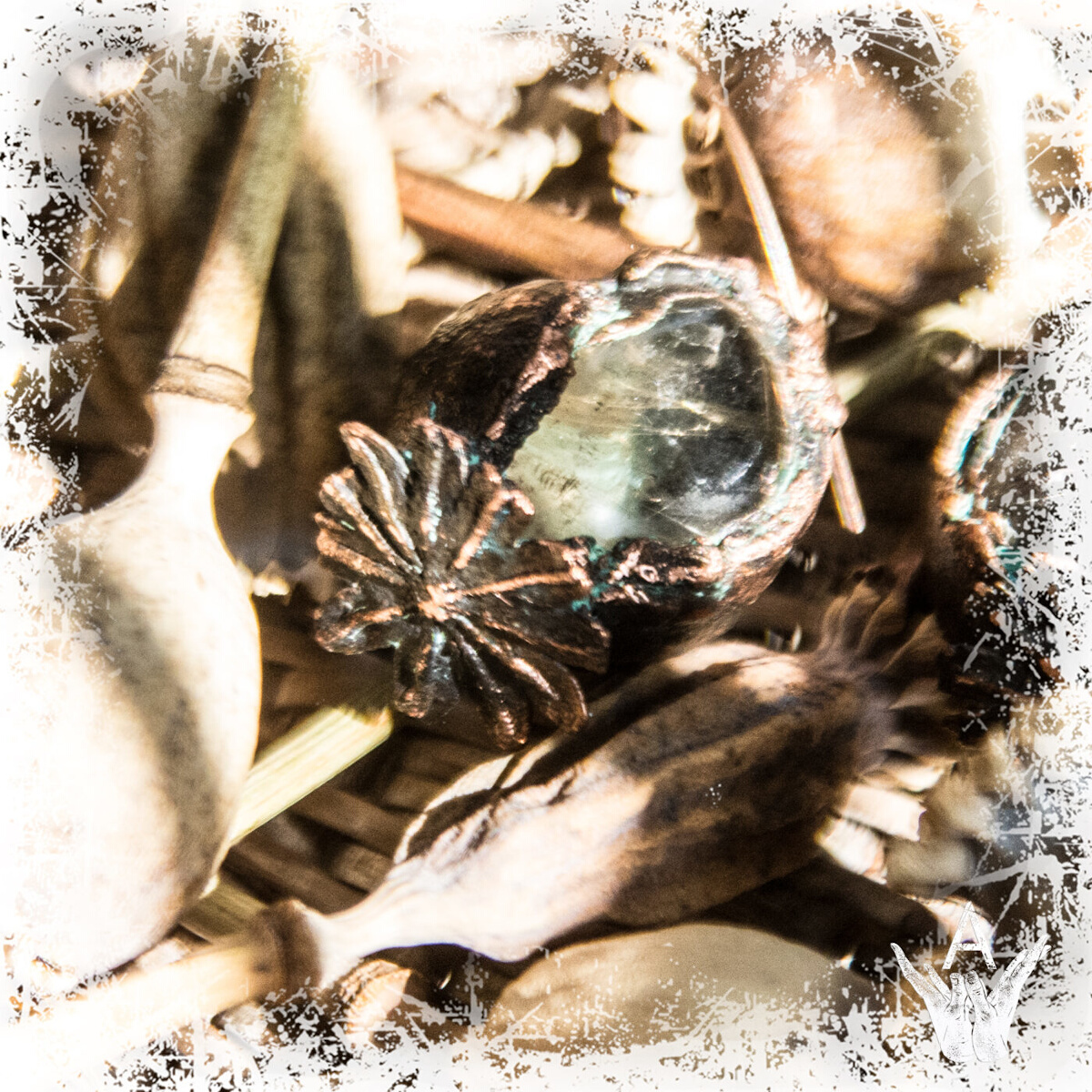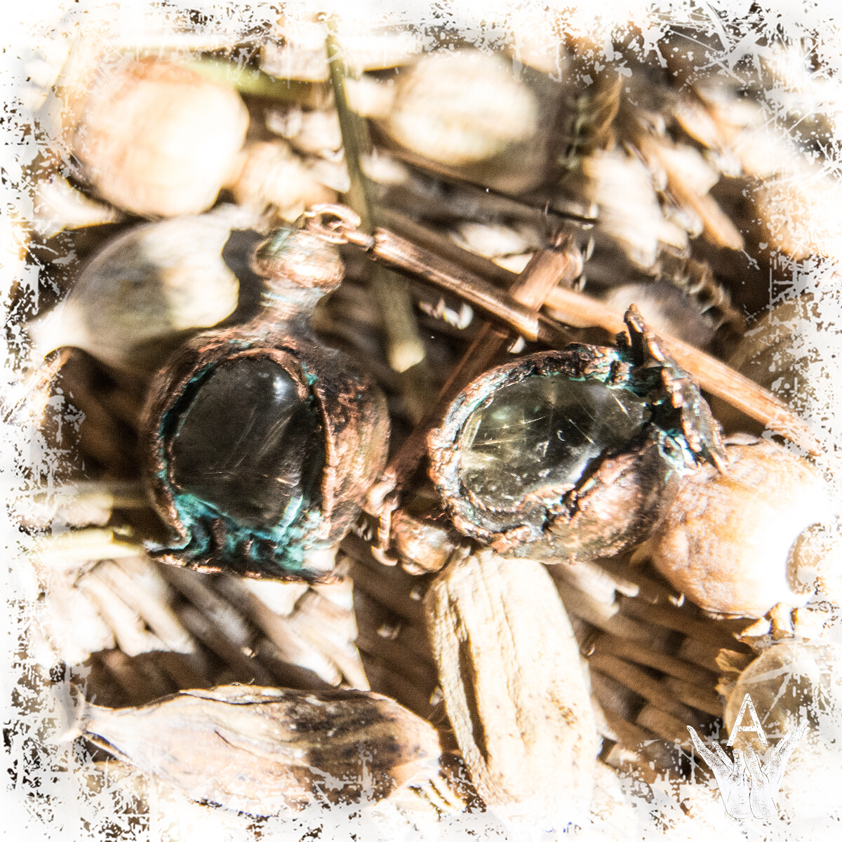 These earrings are made in the form of poppies: galvanized copper and quartz hair-stone, crystal poured into metal. Poppies filled with crystals of Venus Hair — a strong and magical jewelry for women.