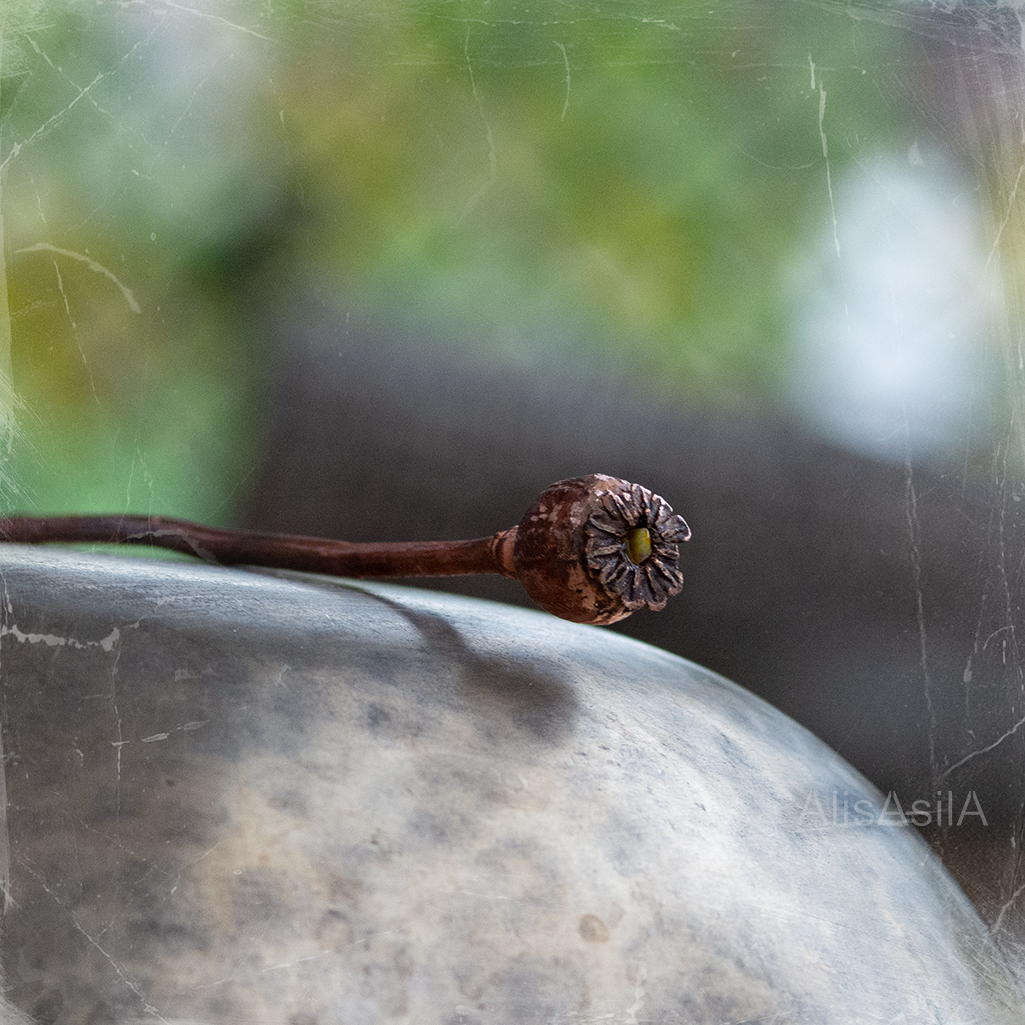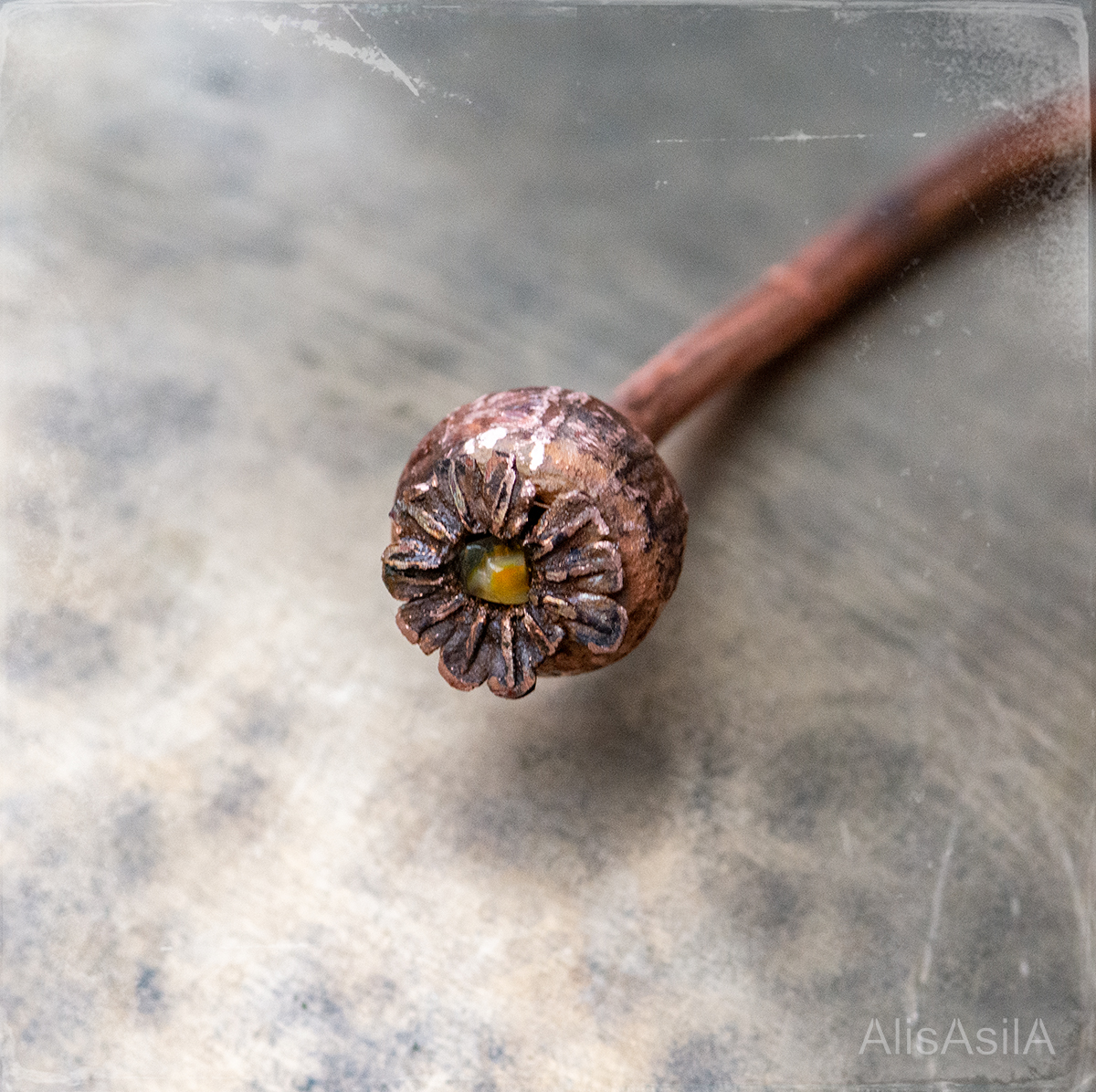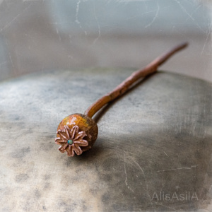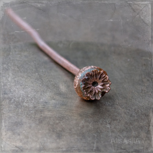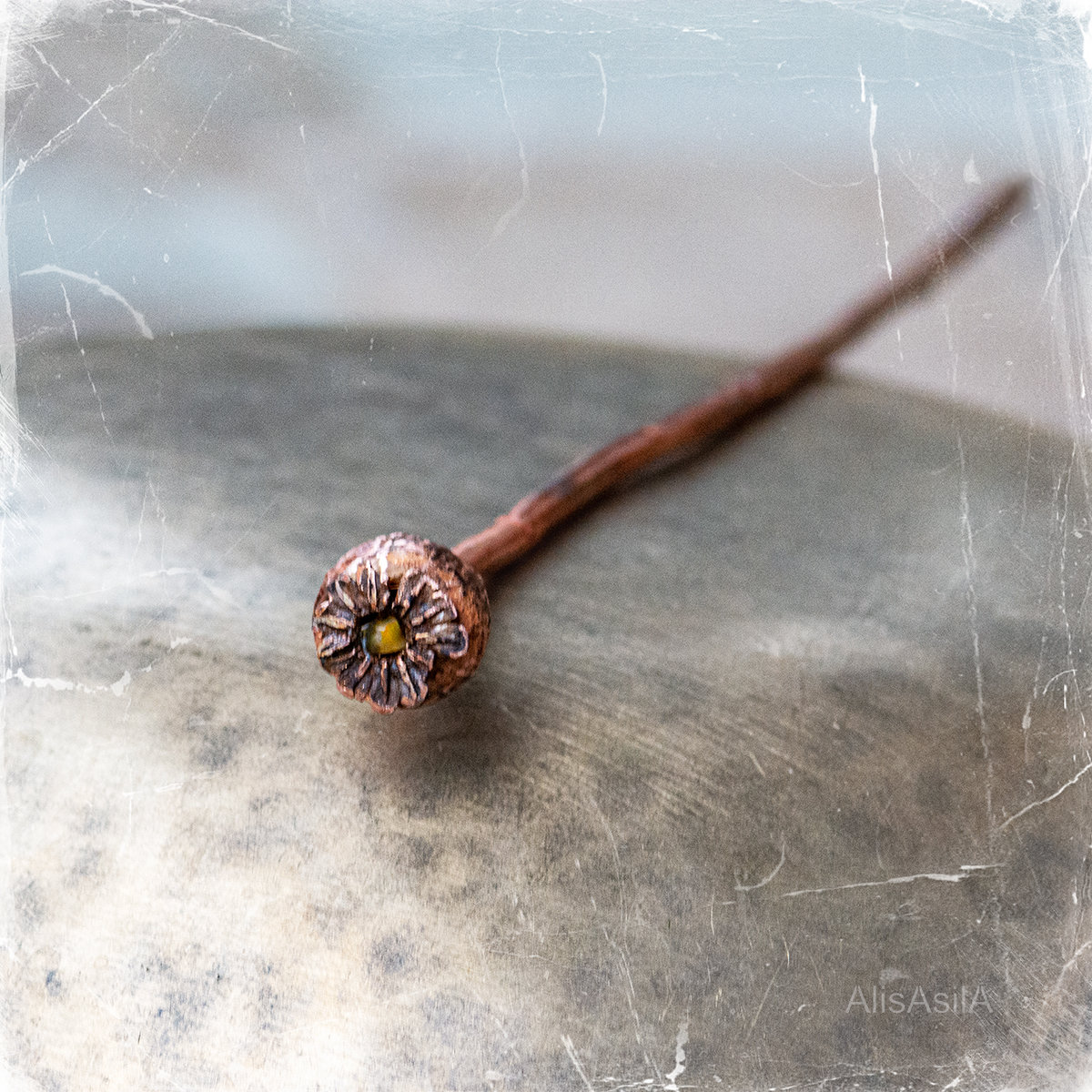 Elegant copper hairpin. Electroformed a poppy head, natural shape and detailed reproduction of the corolla that decorations small opal stone.