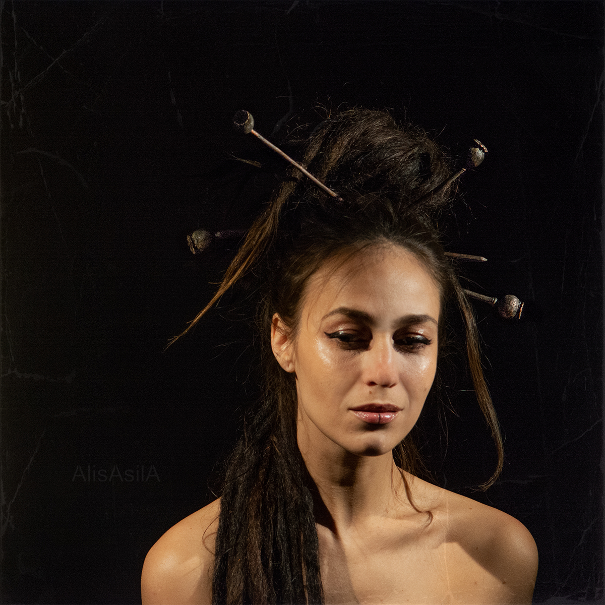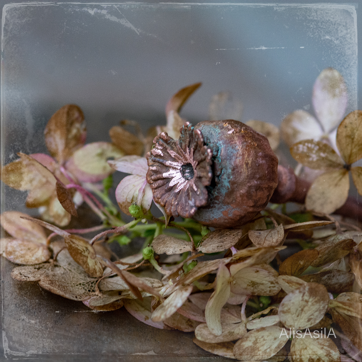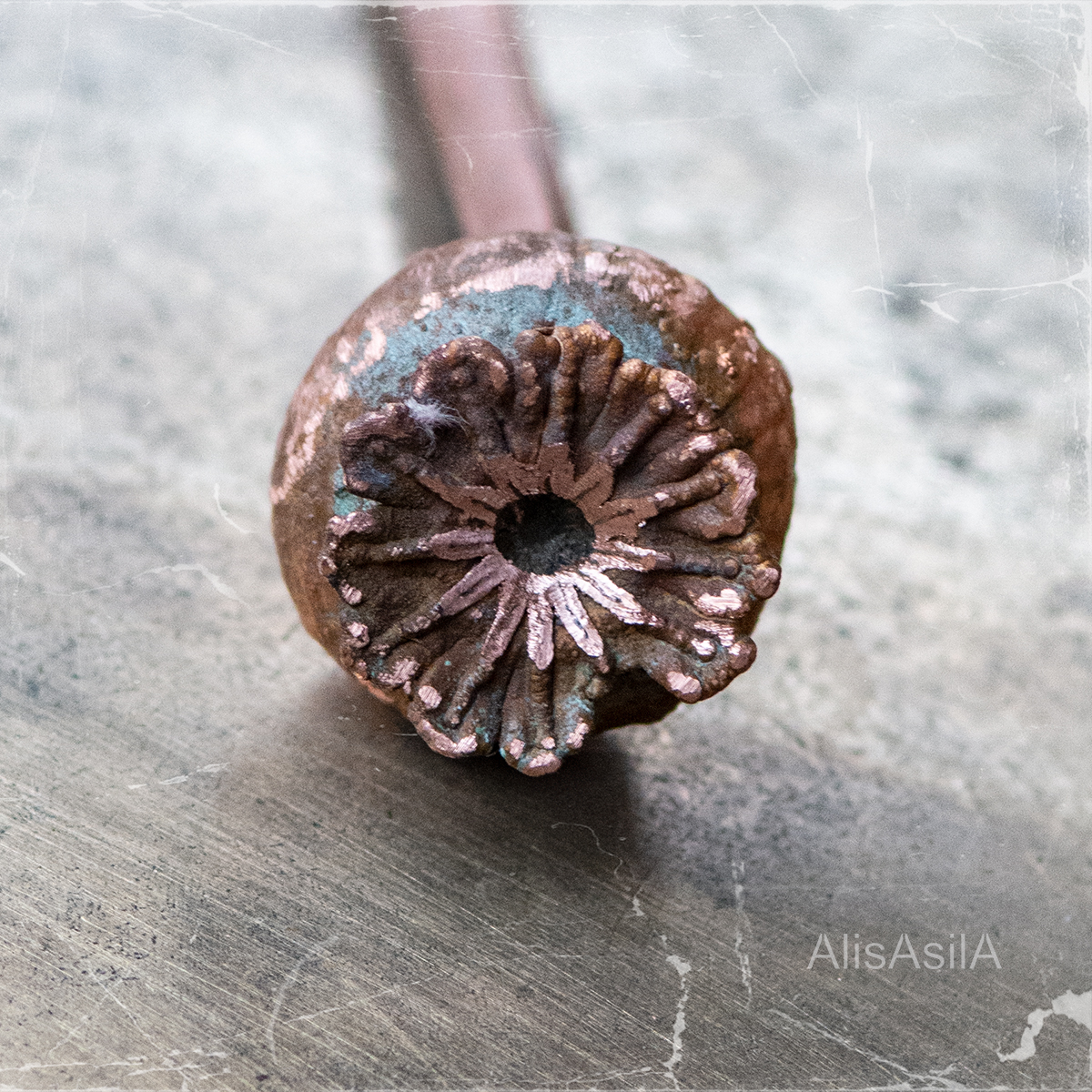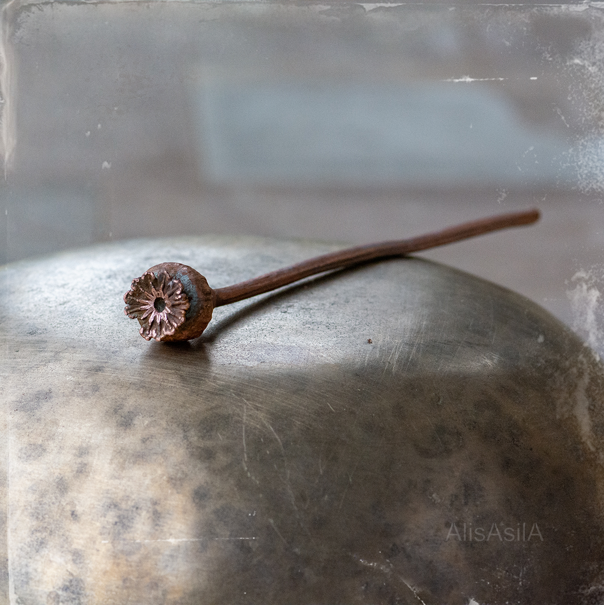 The copper hairpin electroforming of poppy natural shape and detailed recreate wild poppies.