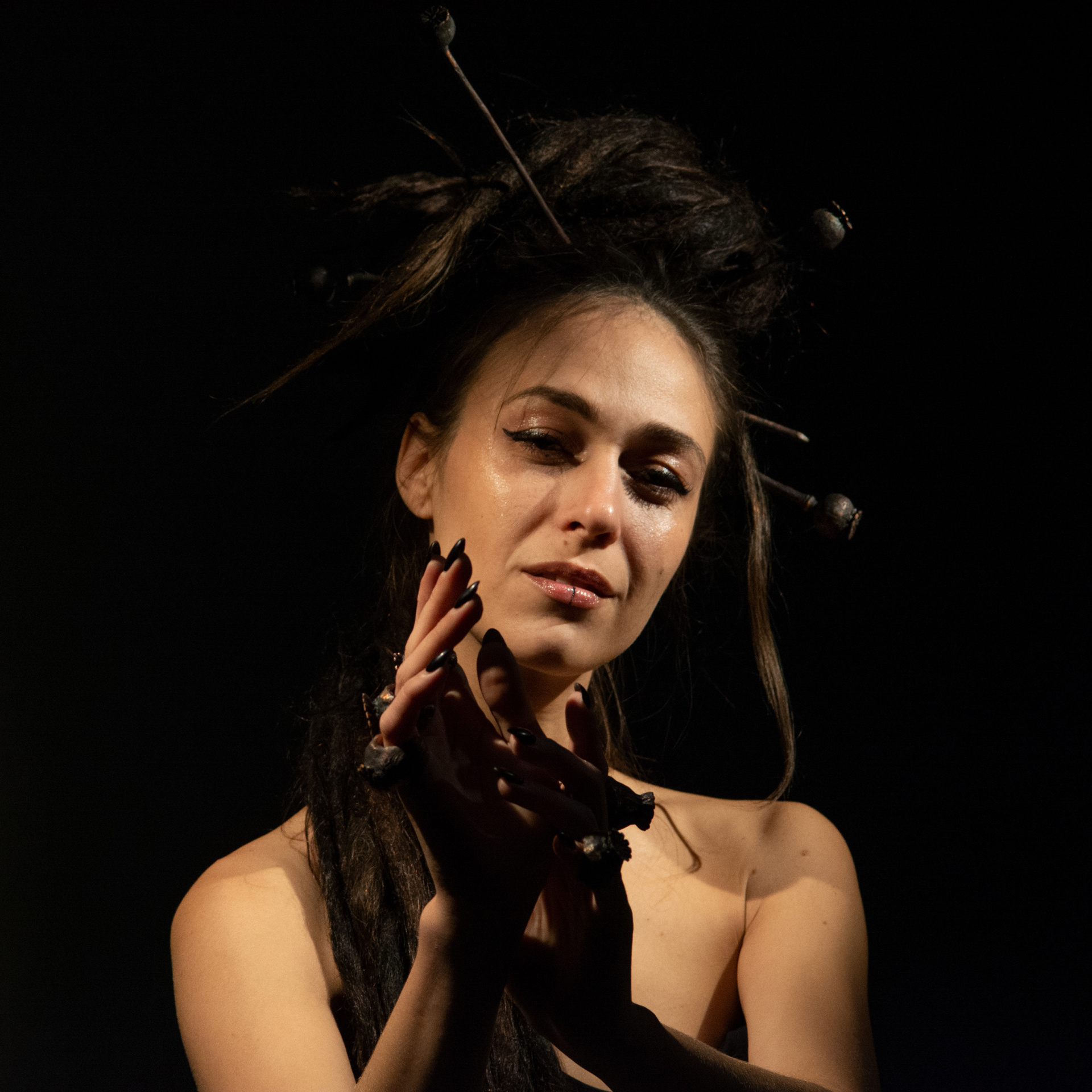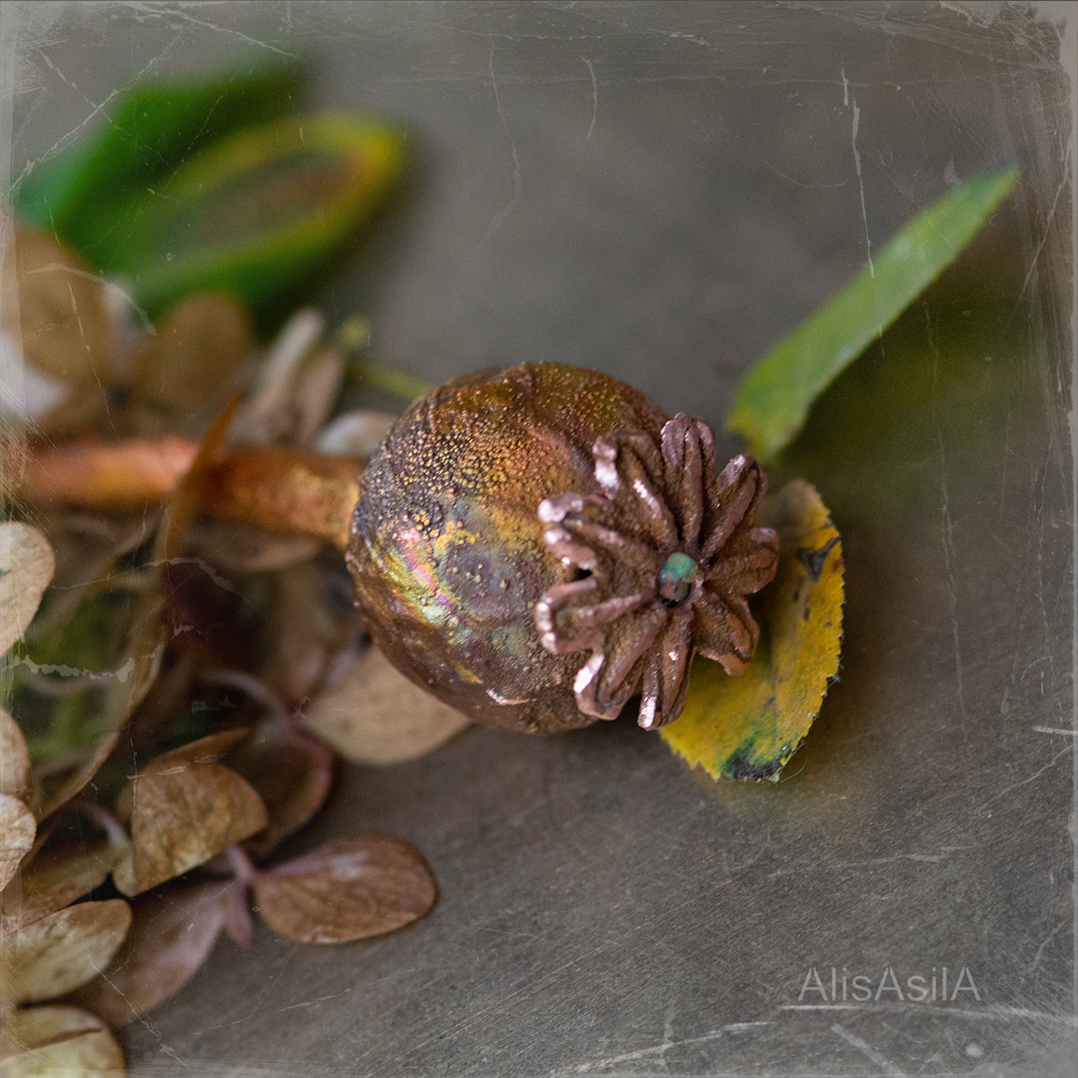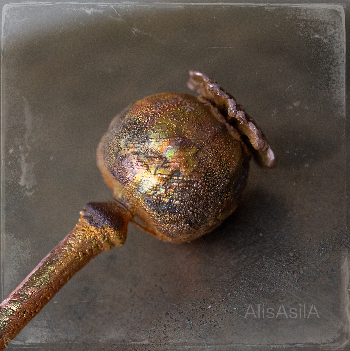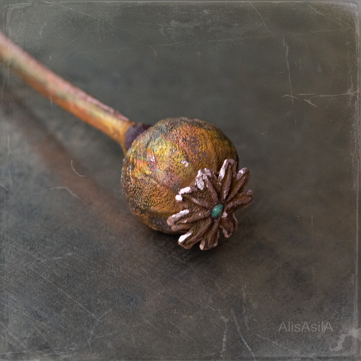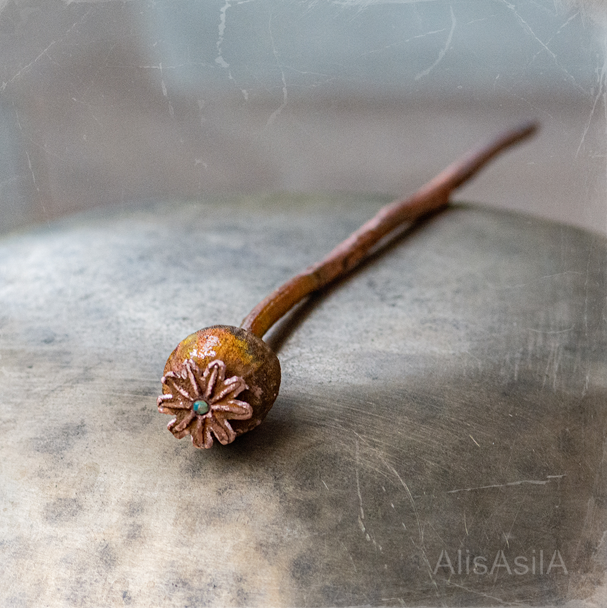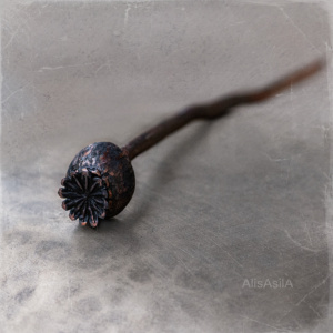 Copper hairpin: opal stone in a poppy head, natural shape, and detailed reproduction using electroforming.