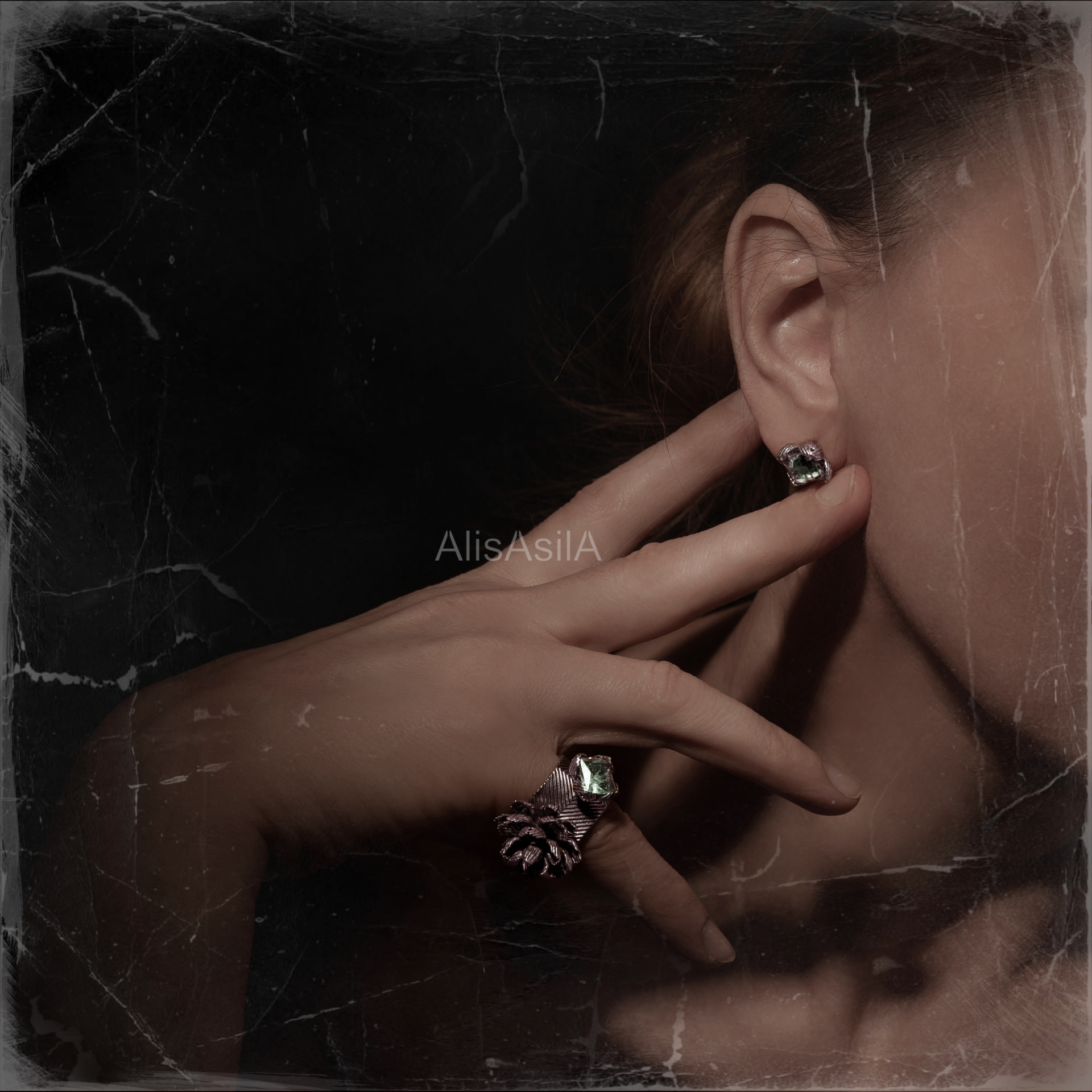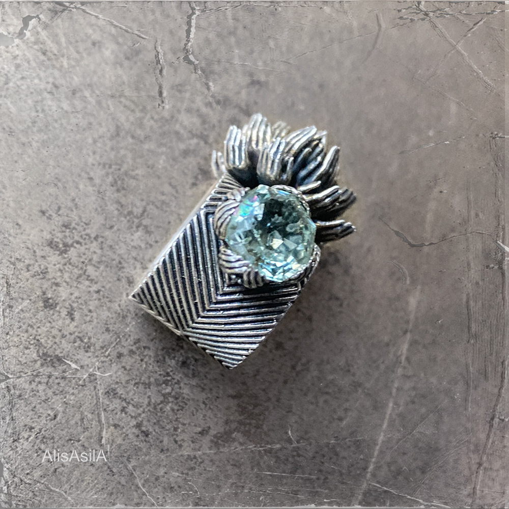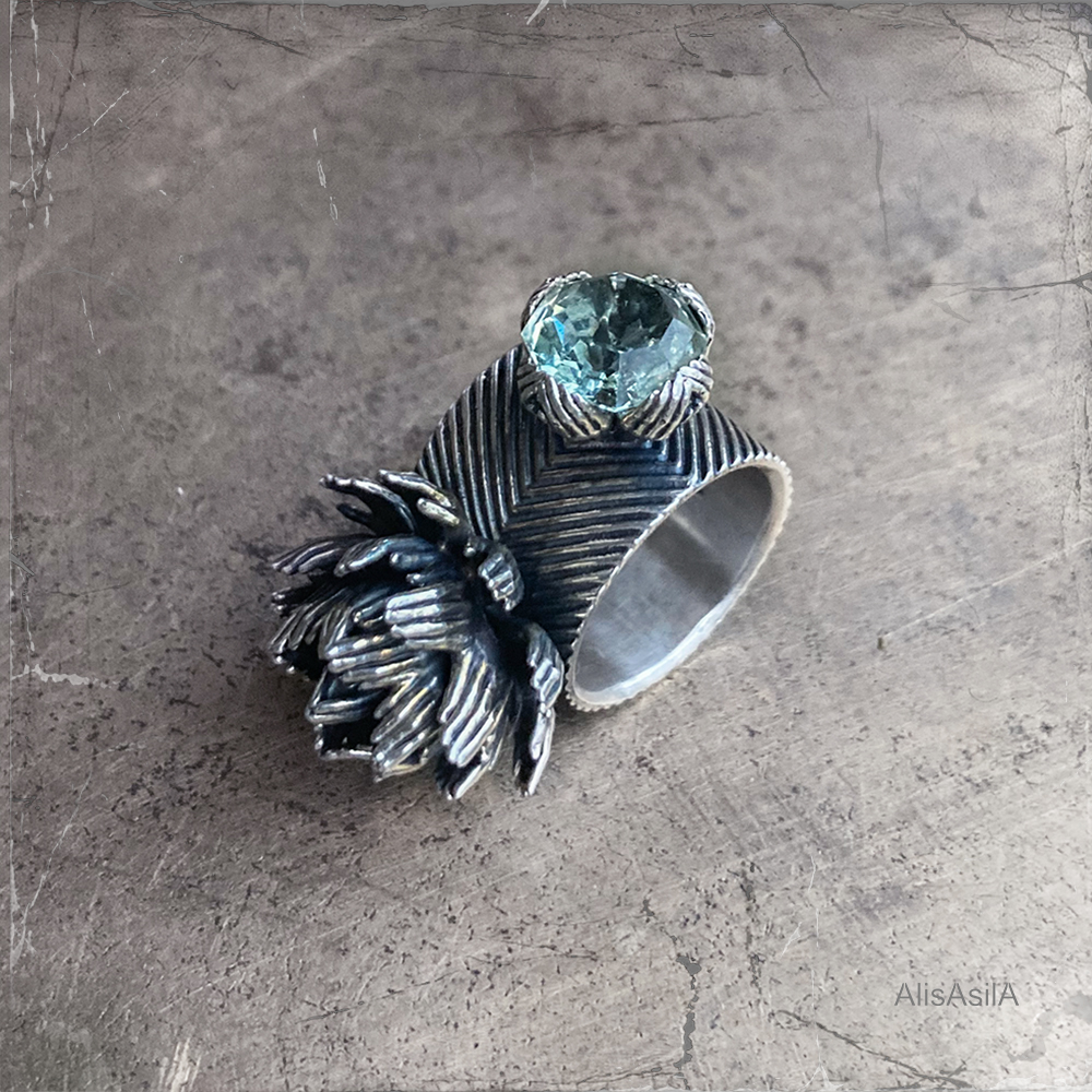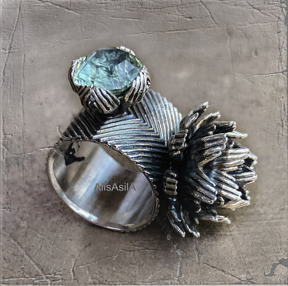 A silver ring with a natural faceted emerald of the Ukrainian region of Polissya and a lotus flower made of palms-petals. The original design of the ring is designed to be worn on the little finger, especially with the green beryl facing upwards.