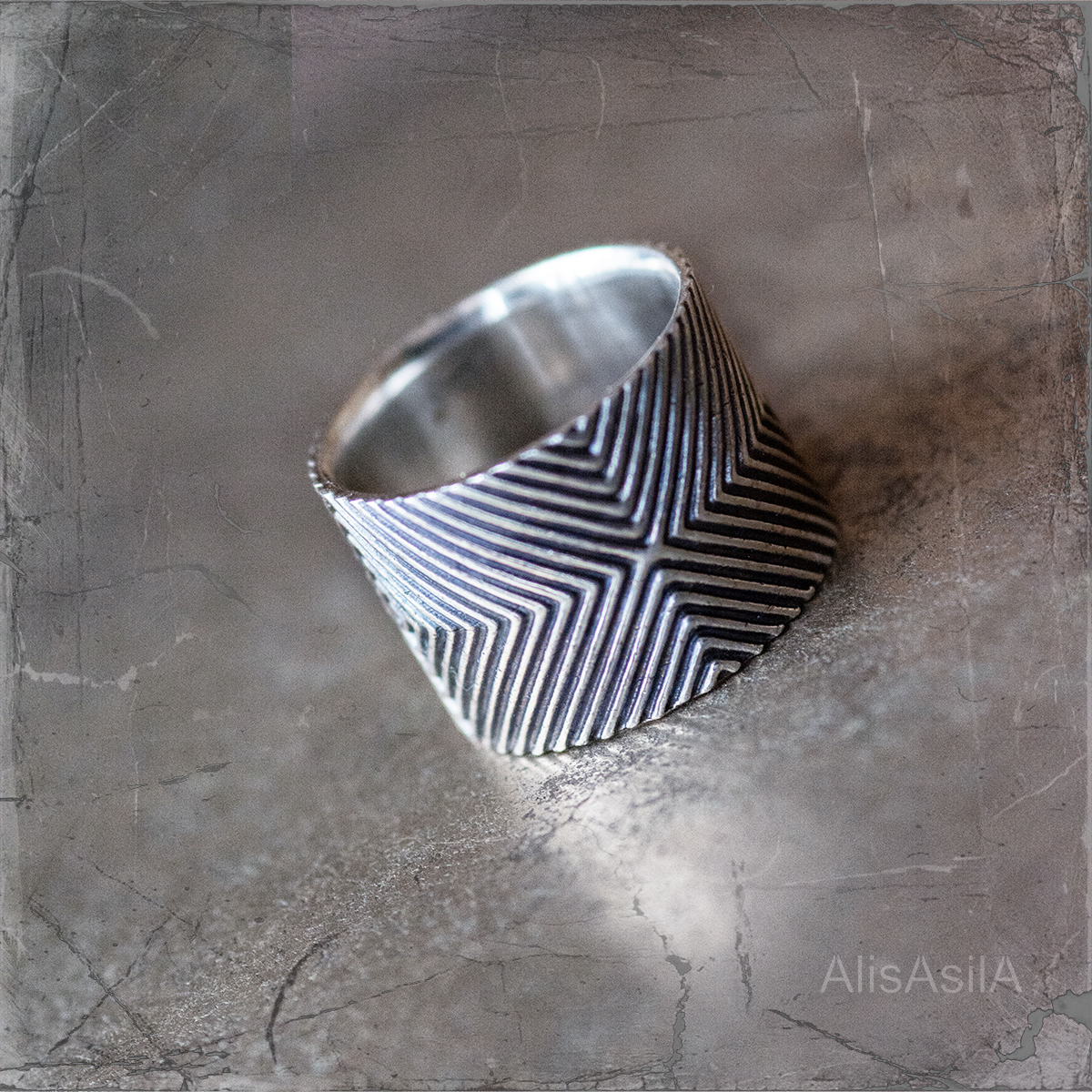 Wide ring with an ornament of darkened silver with engraving: decoration from the collection “Lotus of Unity”, suitable for men and women. The perfect lines of the silver ring are full of symbolic meaning. Lotus outside the Lotus, where one part of the ornament is embodied in silver, and the other one is hidden in the dimensions of the imagination and leaves the imprint of a flower on the slopes of consciousness as a symbol, vibration…
