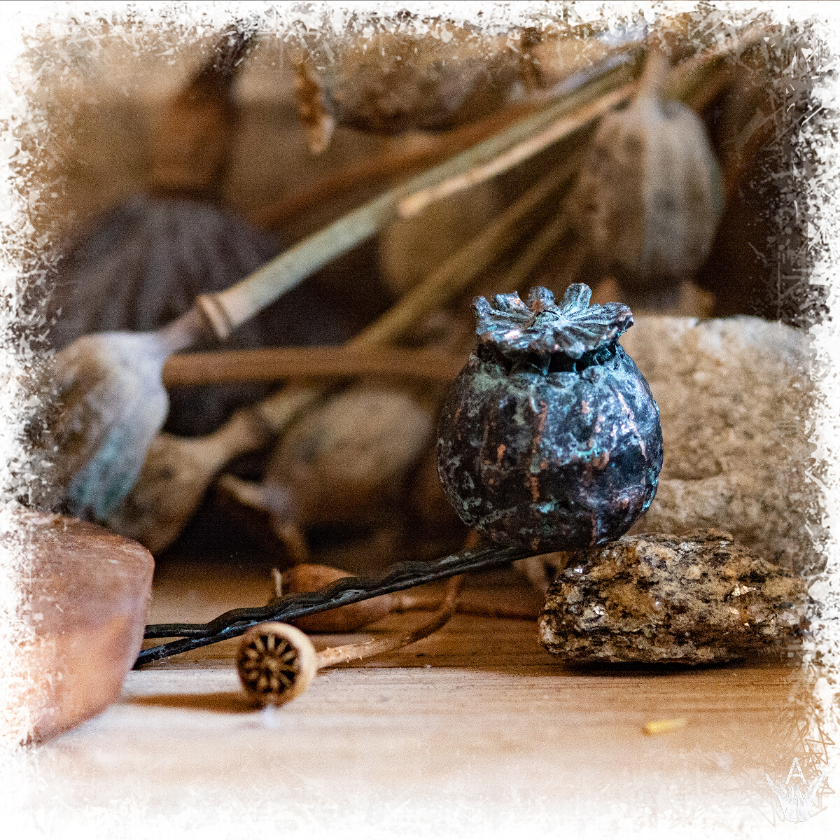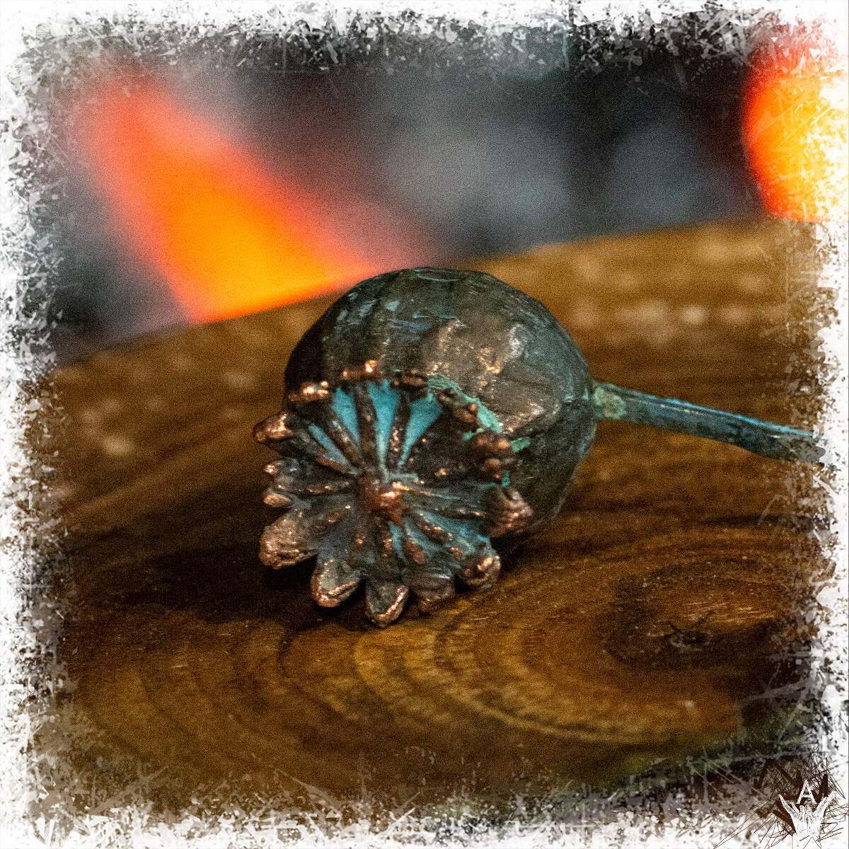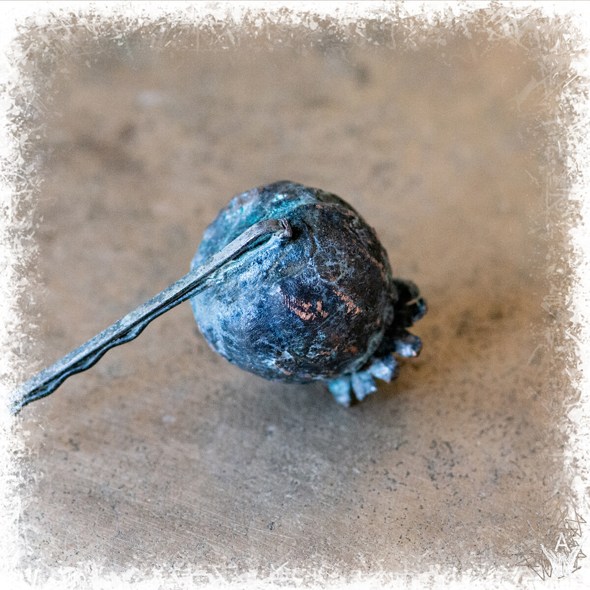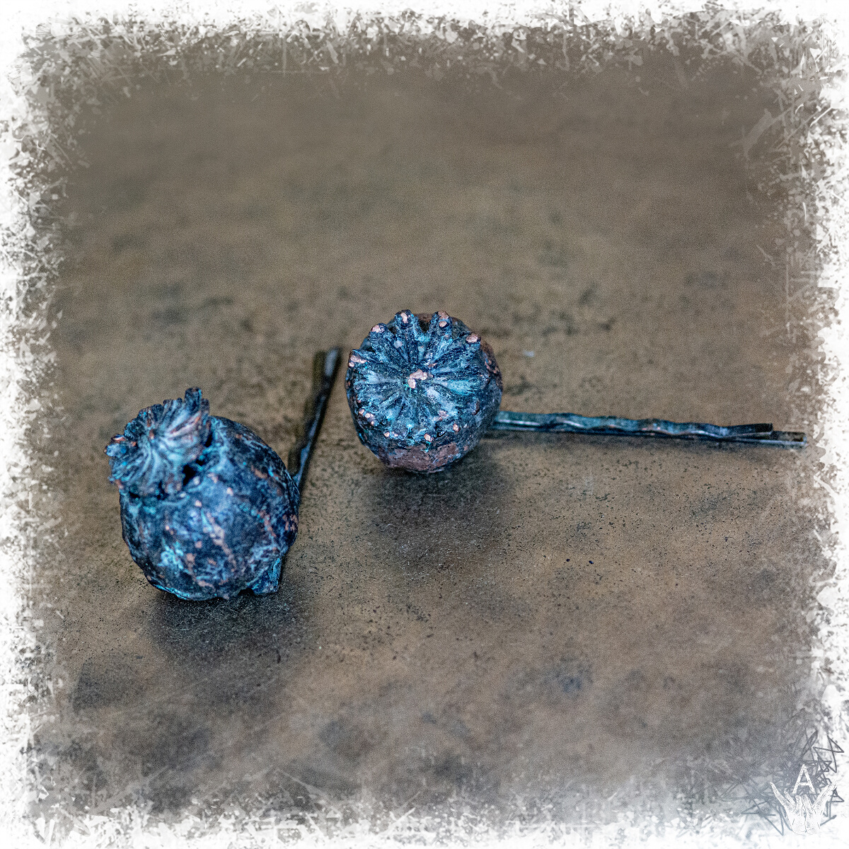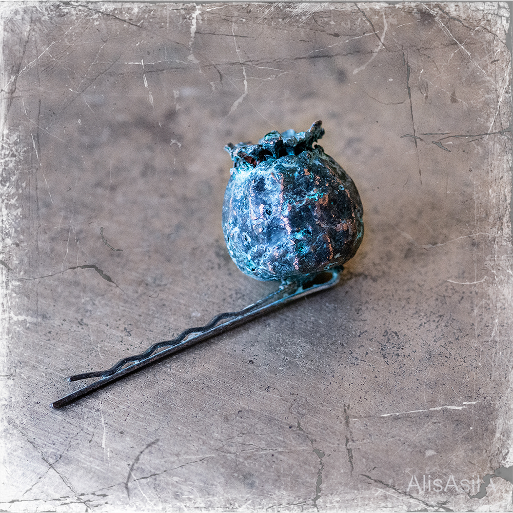 Жіноча заколка у волосся, з маковою головкою, яка зроблена з гальванізованої міді.